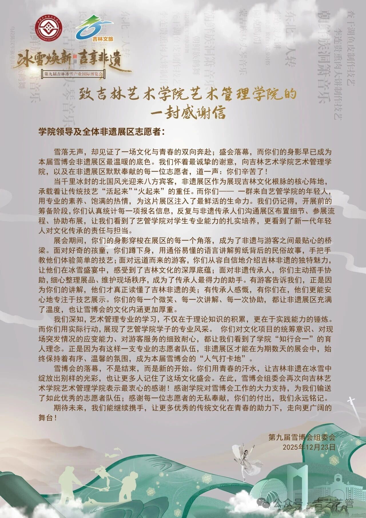 在现场6000平方米场地,176个非遗项目参展的庞大空间内,他们凭借饱满的工作热情和细致的服务,展现了出色的协调与执行能力,让非遗展区充满了温度与活力,把学校教育与艺术实践完美融合,得到了文旅厅领导、展会运营商、传承人及游客们的高度认可,同时也获得了第九届雪博会组委会来函致谢。