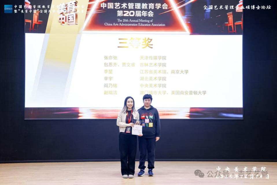 12月13日至14日,以“美育中国”为主题的中国艺术管理教育学会第二十届年会在北京如期举行。本次年会由中国艺术管理教育学会主办,中央美术学院艺术管理与教育学院、中央戏剧学院实验剧团、北京舞蹈学院人文学院、中国人民大学艺术学院、广州美术学院艺术与人文学院承办。我院师生高度重视此次学界交流契机,全程深度参与,在年会多个核心环节中积极发声、充分展示了艺术管理学院的教学成果和学生的综合素养,并斩获了多个奖项。