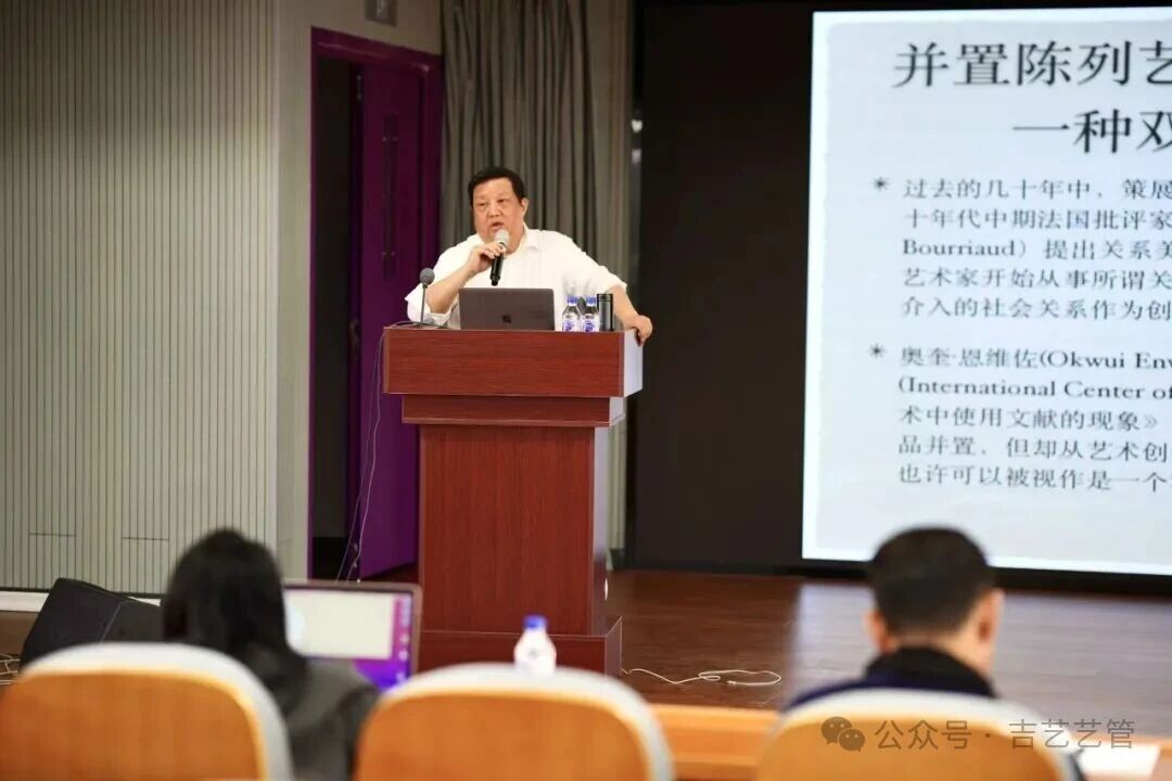 为引导学生从虚拟空间走向现实策展语境,工作坊特别邀请中央美术学院艺术管理与教育学院院长、国家艺术与文化政策研究所所长、中国艺术管理教育学会主席,余丁教授开展系列讲座。讲座由吉林艺术学院艺术管理学院副院长范春艳教授主持,艺术管理学院、美术学院教师与学生共同参与,旨在搭建贯通学术与实操的多维学习平台,深化学生对当代策展生态的深度认知。